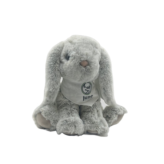 June Mountain's 8 Inch Soft Bunny Plushie. Made with 100% Recycled Stuffing. Machine Washable.