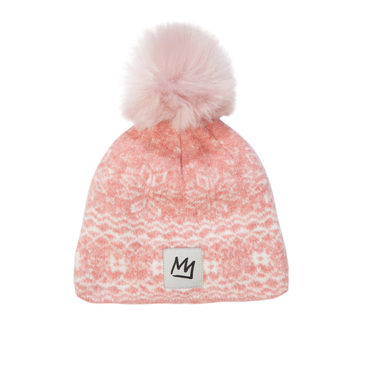 A standard take on this fitted Jacquard beanie with faux fur pom and black Crown...