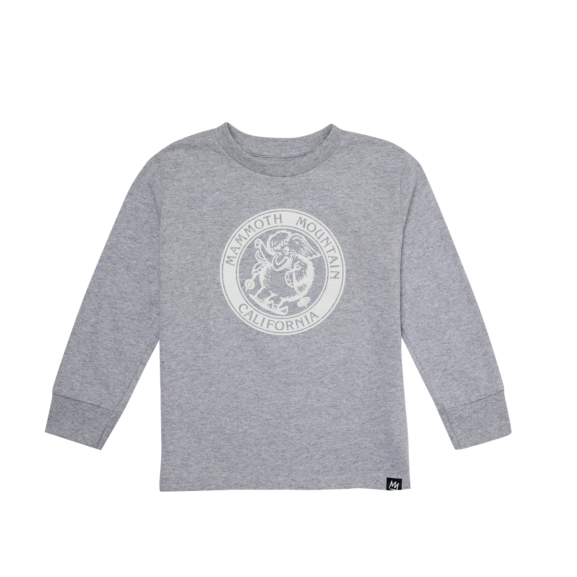 Infant sized Skiing Woolly Long Sleeve T-Shirt with Mammoth Mountain skiing Woolly logo print on the front. 100% cotton.