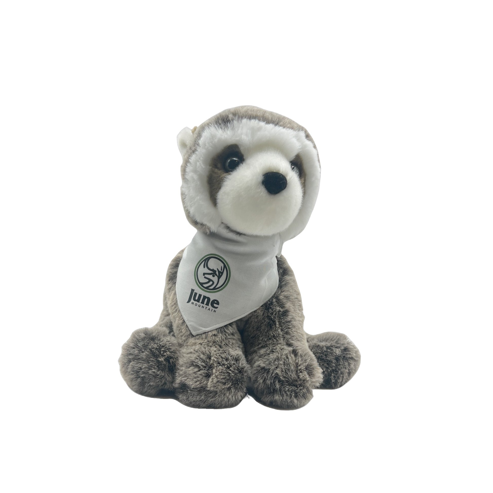 June Mountain's 9 Inch Soft Raccoon Plushie. Made with 100% Recycled Stuffing. Machine Washable.
